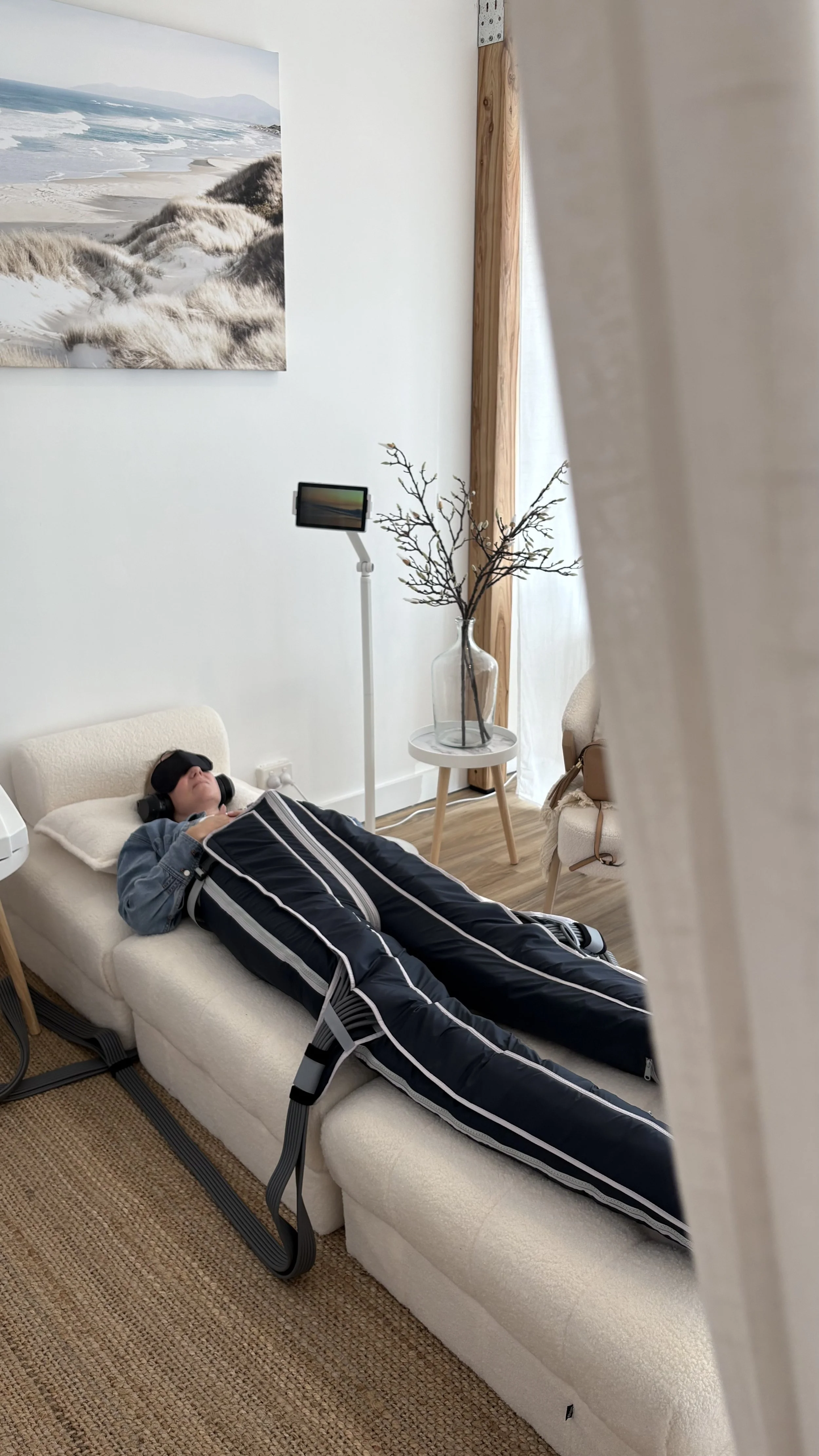 This advanced suit from high waist down to your toes, uses precise technology to achieve lymphatic drainage. Offering custom treatments based on your body's needs. Various compression techniques are selected, to stimulate lymphatic vessels, specifically guiding lymph fluid through the lymphatic system. This improves circulation & lymph flow, detoxification, immune function, metabolic & digestive function and supports overall wellness. Ideal for post surgery or injury.